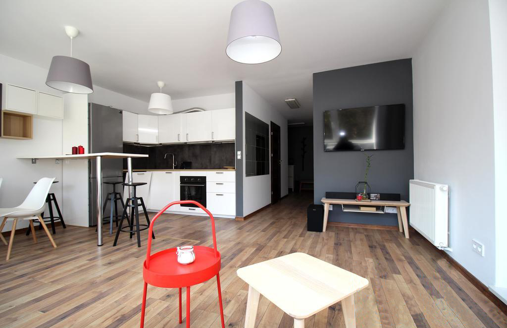 Mieszkania dwupokojowe położone na wysokim parterzez kuchnią wraz z jadalnią otwartą na salon, łazienką oraz WC osobno, znajdują się w nowowybudowanym domu wielorodzinnym zaprojektowanym przez KONIOR Studio
