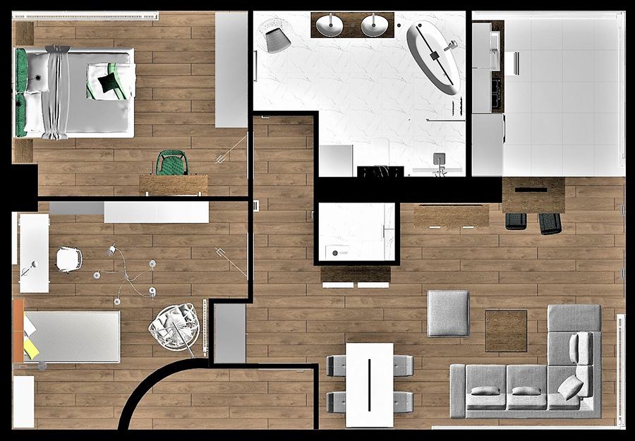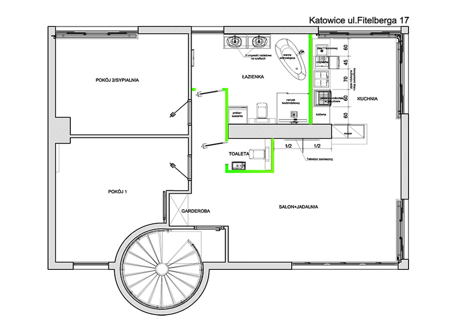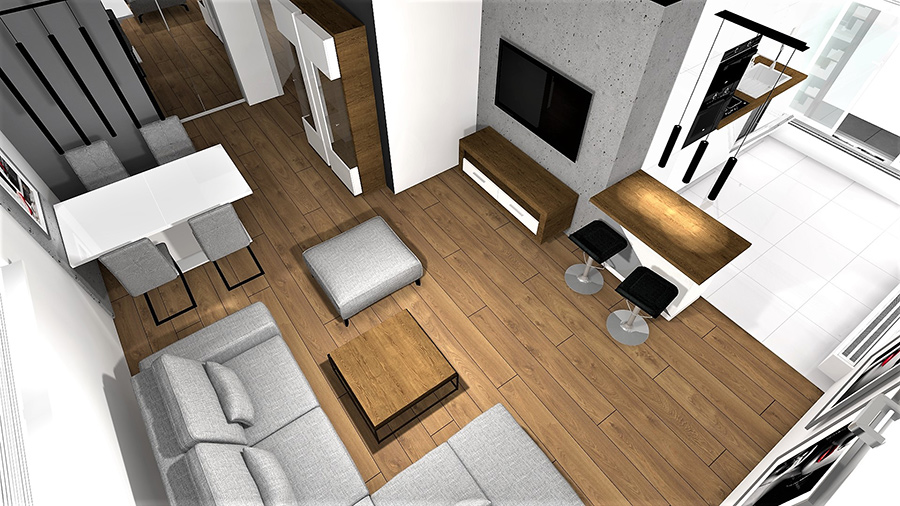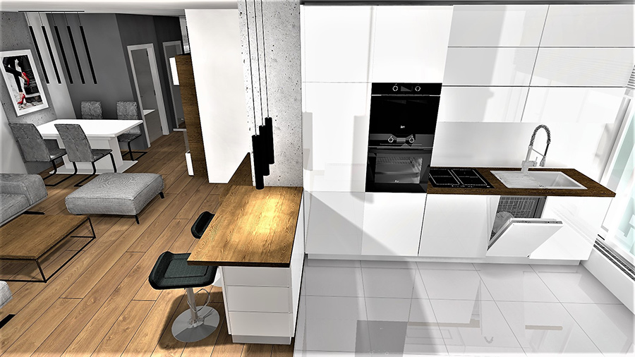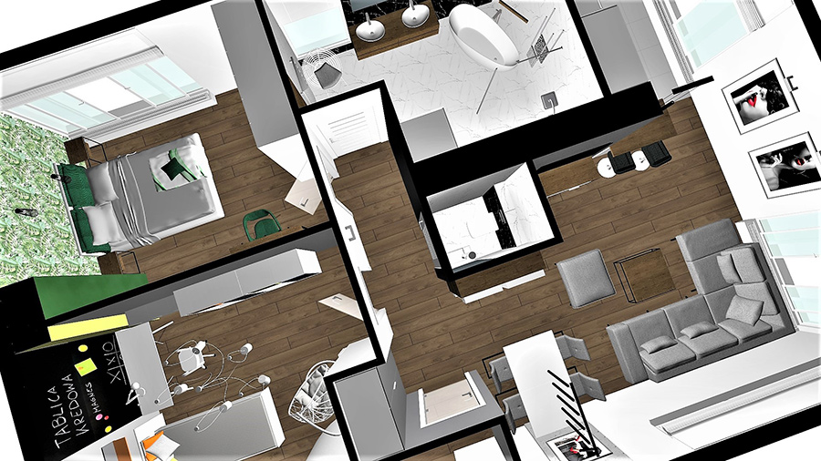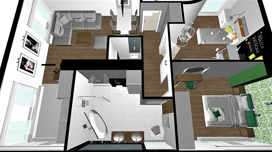 | Mieszkanie czteropokojowe położone na drugim piętrze z kuchnią wraz z jadalnią otwartą na salon, dwoma łazienkami z WC znajduje się w nowowybudowanym domu wielorodzinnym zaprojektowanym przez KONIOR Studio